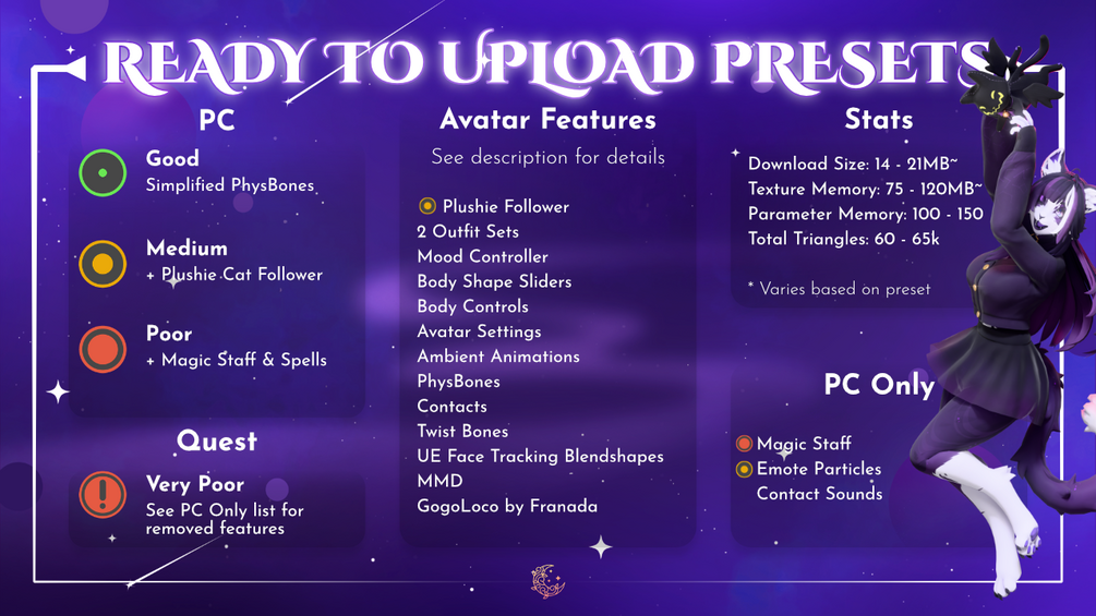 Discord⚠️ This product requires basic knowledge of the VRChat Creator Companion and Unity 2022 to use! It is recommended to have at least installed Unity and created a blank Avatar project before - you can check out the Guides in advance in the Simple Usage section below.Features